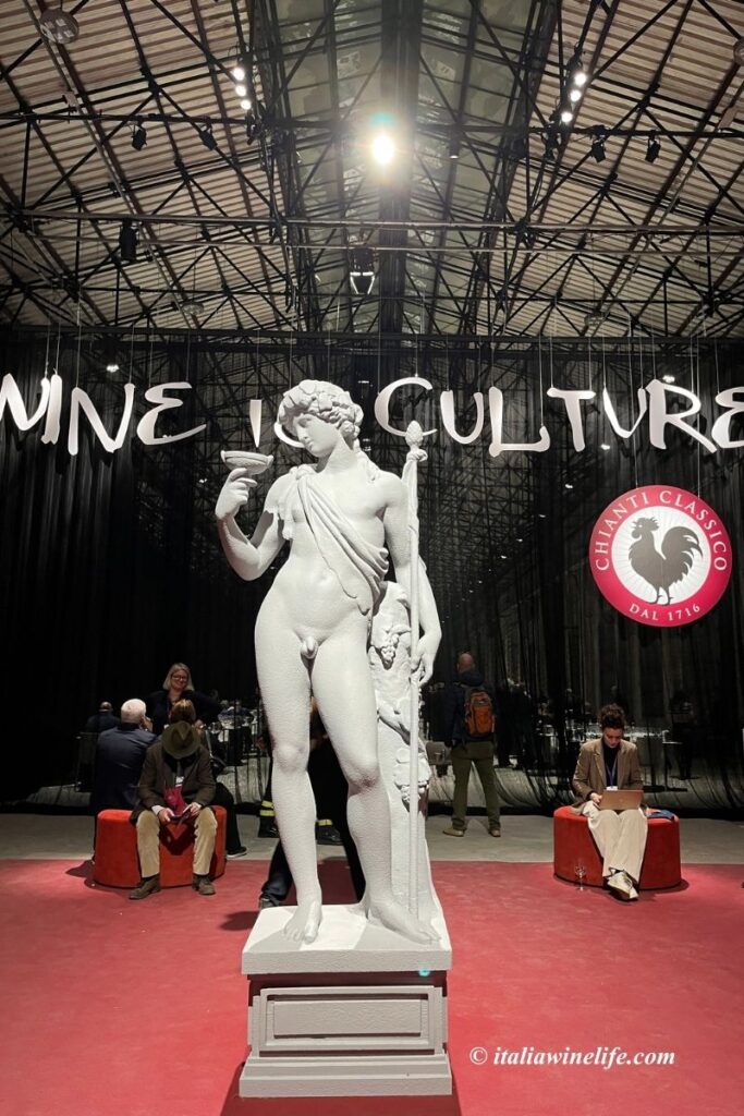 入口にはミケランジェロのバッカスの彫刻のオブジェが設置され、ワインが単なる飲み物ではなく、歴史・芸術・人の営みと結びついた文化そのものであることを象徴しているようでした。